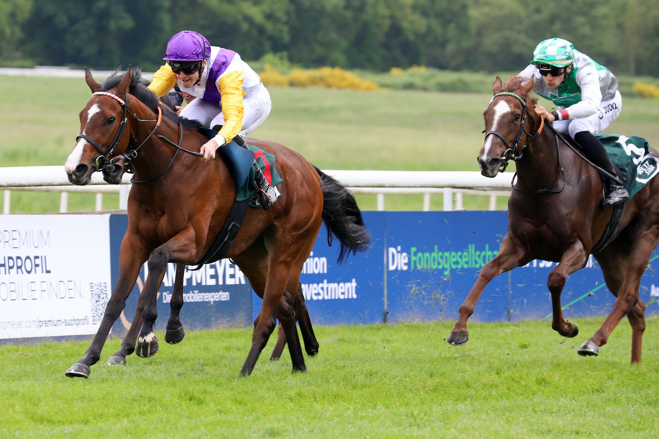STAUFFENBERG BLOODSTOCK graduates stamped their class on the Karin Baronin von Ullmann – Schwarzgold‑Rennen, Gr.3 at Cologne on Sunday, with seasonal debutante SANTAGADA by SOLDIER HOLLOW storming home to win, while  LIPS  VEGA by LOPE DE VEGA fought bravely for third after forcing a searing early pace.